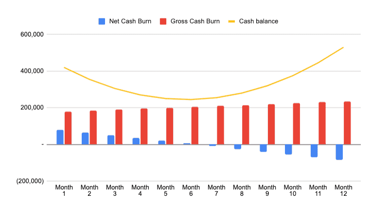 Om alles per maand gedetailleerd voor te stellen, is het aangeraden om een grafiek op te maken. Hier kan je op de x-as de maanden weergeven en op de y-as de cash. De hoeveelheid cash die aanwezig is binnen jouw onderneming en de voorspelde cash burn worden op die manier weergegeven op de grafiek. Hieronder is een goed voorbeeld van een runway grafiek weergeven.